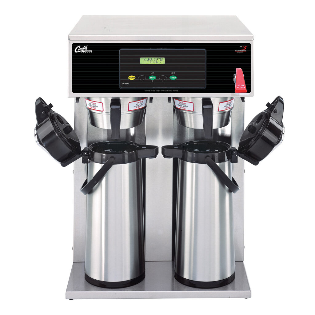 The Curtis D1000GT Twin Airpot Brewer is a commercial‑grade, high‑capacity coffee brewing system with two independently programmable brew heads, making it easy to serve two different coffees side by side — ideal for busy cafés, offices, and foodservice settings. Its digital control panel and scroll‑through programming deliver precision and consistency, while brewing directly into airpots keeps coffee hot and flavorful for self‑serve environments.